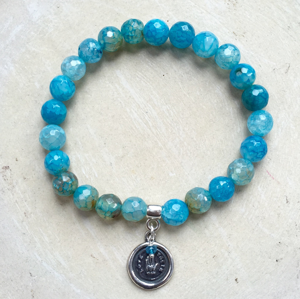 Faceted ethereal blue agate gemstones evoke the beauty of shore and sky. Sterling silver bail and charm accented by faceted blue quartz gemstone. Approx. 7.5", stretch bracelet. Limited Edition.